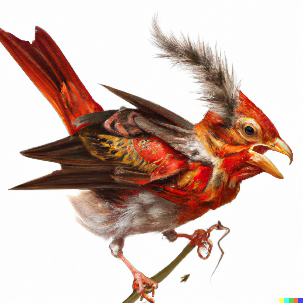 Respectively, "Michelangelo painting, a little red songbird with many large head feathers whose wings become bones, fingers instead of claws, side view, on a white background", "Michelangelo painting, a little golden scarab wearing a white cloak that becomes wings, on a white background", "John Singer Sargent painting, a wet slug wearing gleaming medieval armor with an ornate crown, on a white background", "John Singer Sargent painting, a gilded wet horseshoe crab wearing gleaming ornate medieval armor, on a white background"